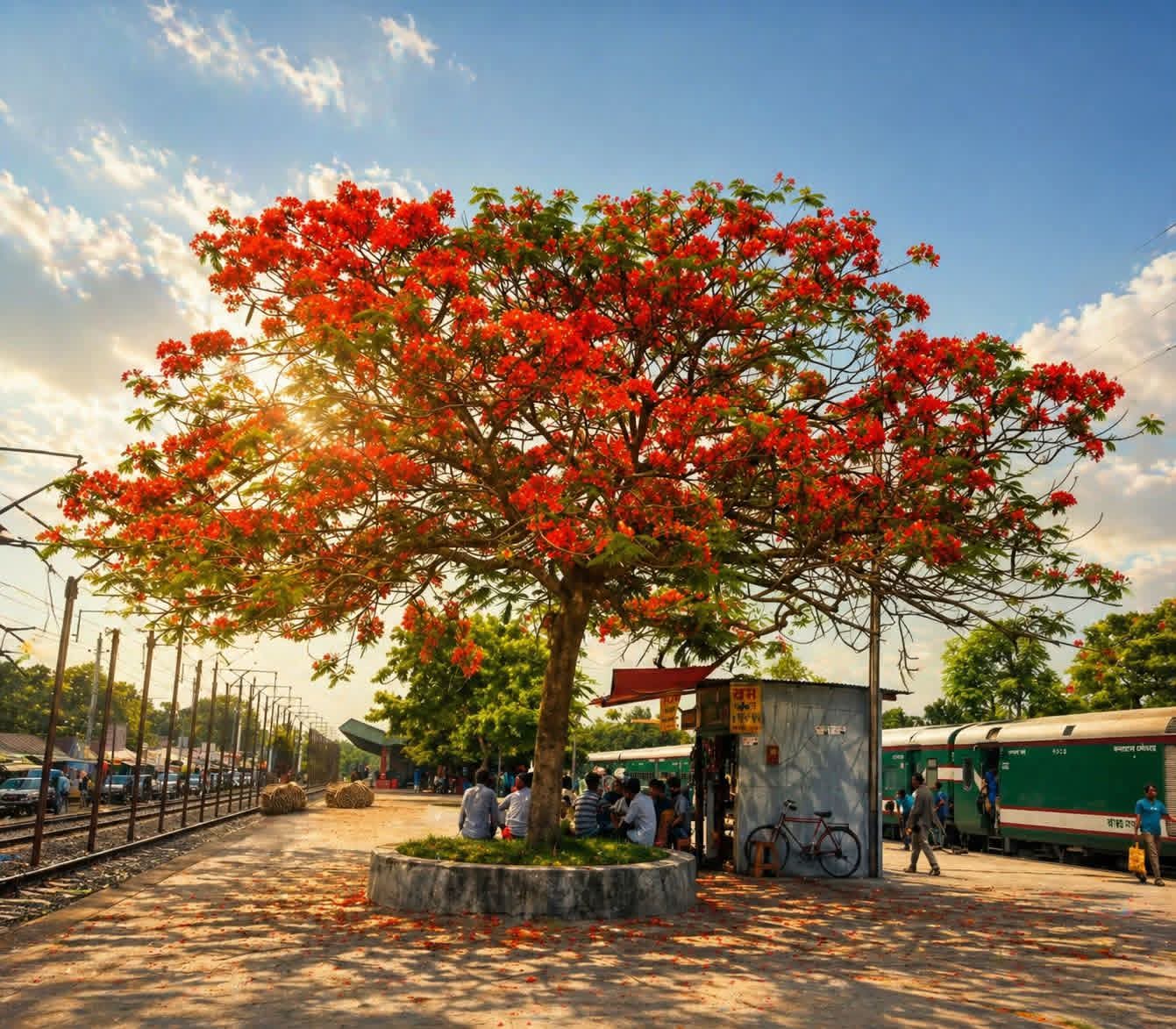 কালুখালী জংশন রেলওয়ে স্টেশনে কৃষ্ণচূড়ার আগুনঝরা রূপে মুগ্ধ দর্শনার্থীরা